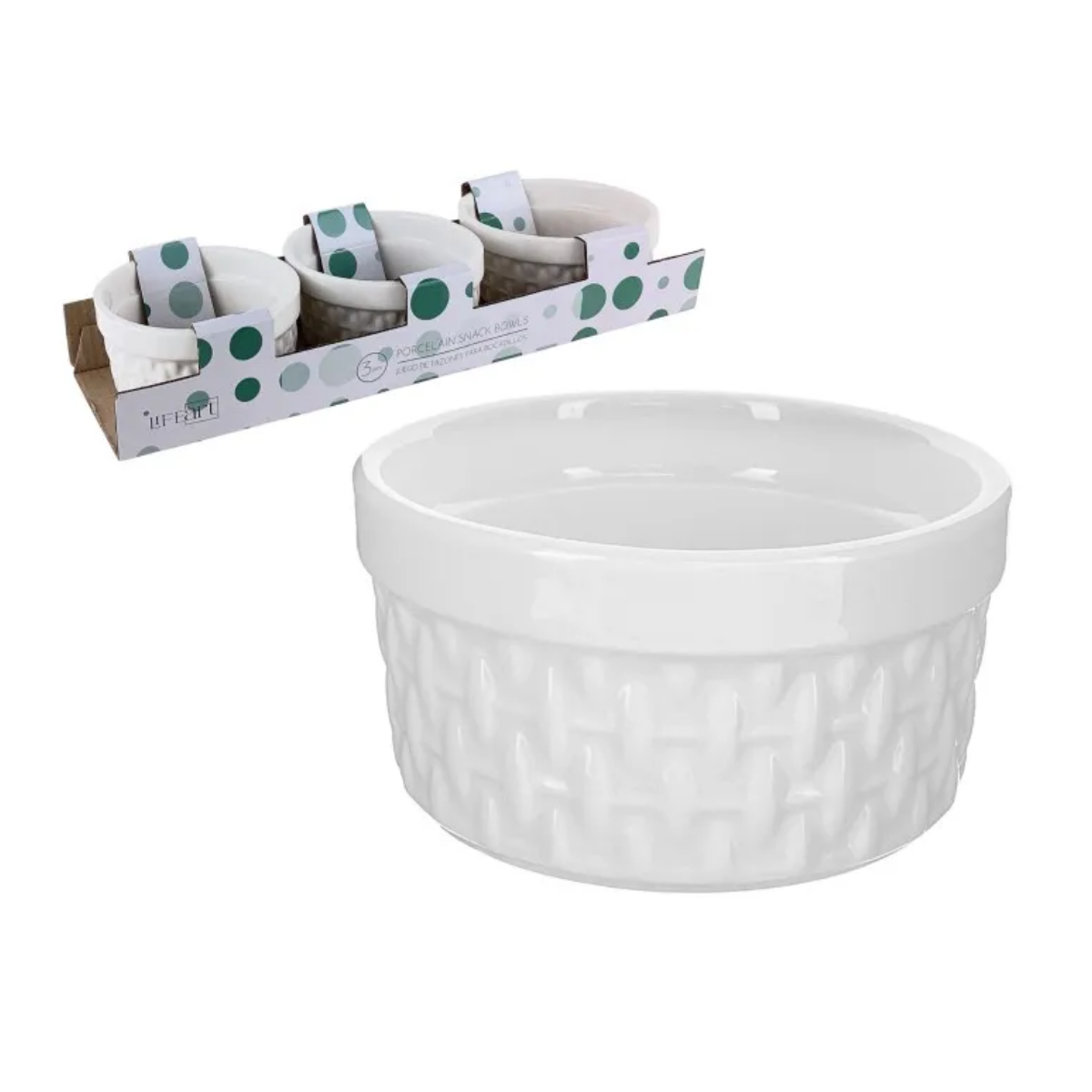 Elevá la presentación de tus platos con este Juego de 3 Bowls Multiuso, diseñados para ofrecer funcionalidad y estética en tu cocina. Fabricados en porcelana de alta calidad, estos recipientes son ideales tanto para el servicio de mesa (copetineros, dips, snacks) como para la cocción de recetas individuales. Su exclusivo diseño exterior en relieve (panal) no solo aporta un toque moderno y elegante, sino que mejora el agarre, evitando deslizamientos accidentales.