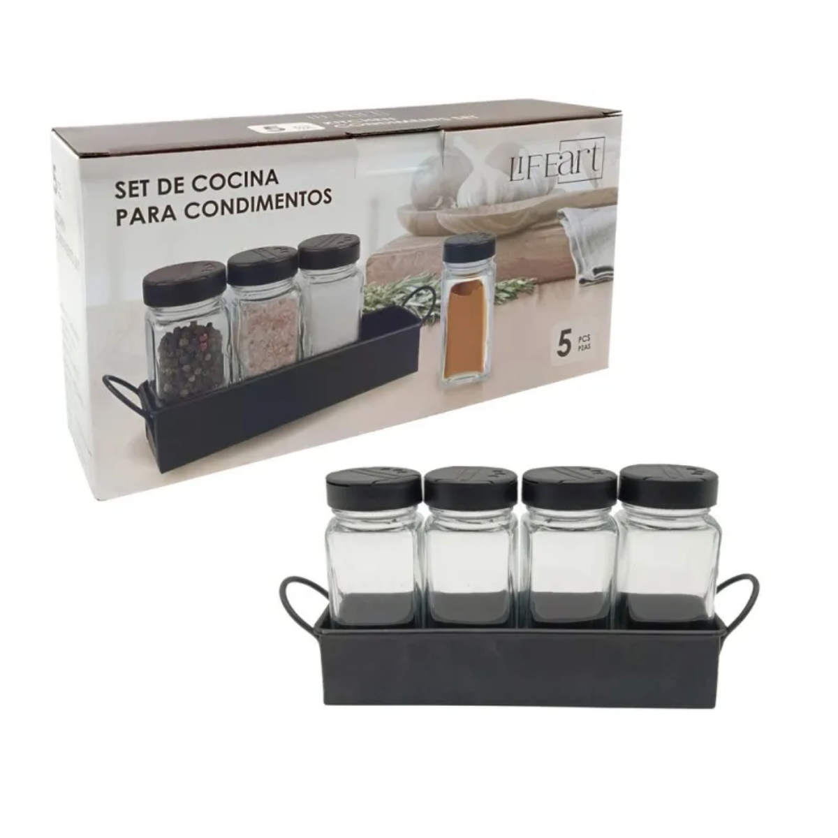– Set Completo: Incluye 4 frascos de vidrio y 1 soporte de metal negro con asas.